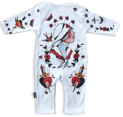 Soft touch playsuit with long sleeves and legs. Allover print of traditional tattoo designs on a white background.