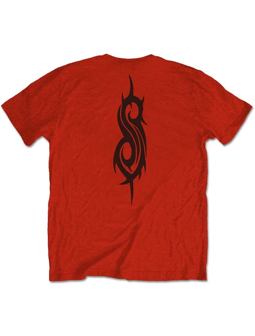 - Red unisex t-shirt featuring front and back prints. The front print is of the Black Choir from the film clip of Slipknot’s 2019 song “Unsainted”. The back print is a black rendition of the classic tribal S.