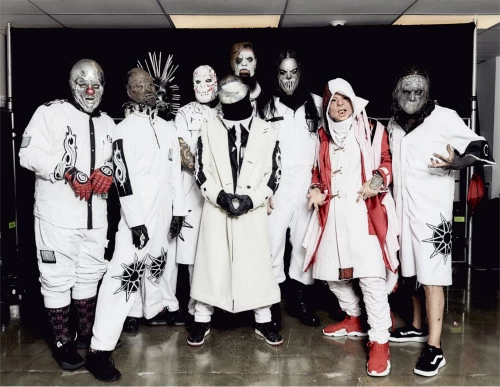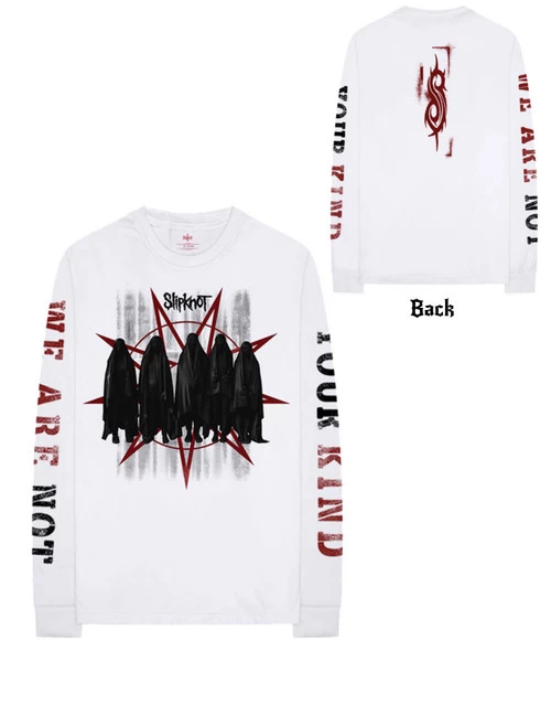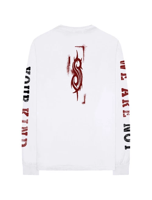 White unisex long-sleeve t-shirt featuring front, back and arm prints based on the artwork and themes from Slipknot’s sixth studio album, “We Are Not Your Kind”.