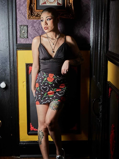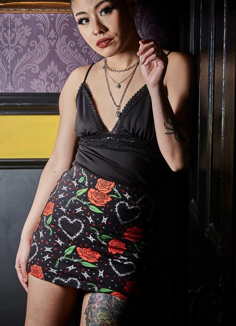 The new Barbed Wire Love mini skirt is made out of a stretchy cotton spandex knit, and features our barbed wire hearts and roses print! It also has an elastic waistband for added comfort and a perfect fit!