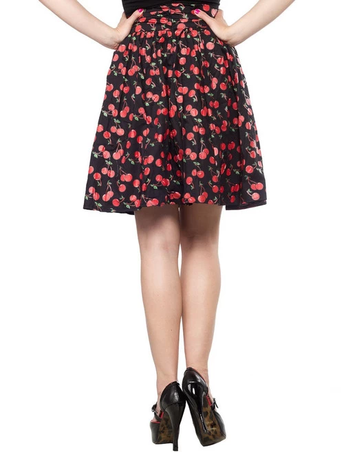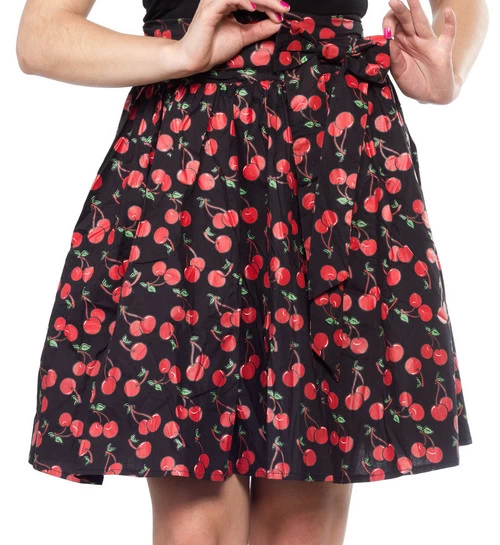 - Black swing skirt with an all-over cherry print and a detachable bow.
