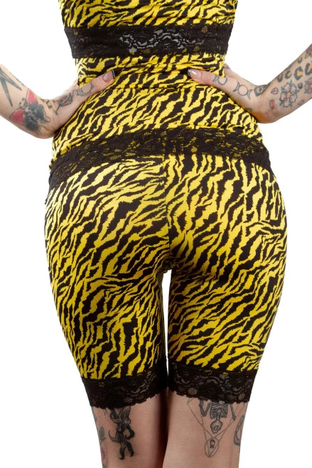 Add a serious pop of color to your wardrobe with the new Hi Waist Pizzazz shorts in Yellow Zebra! These stretchy bike style shorts look great under dresses, skirts, or worn with your favorite band tees – the possibilities are endless! They have an elastic waistband and are also trimmed in a soft black stretch lace.
