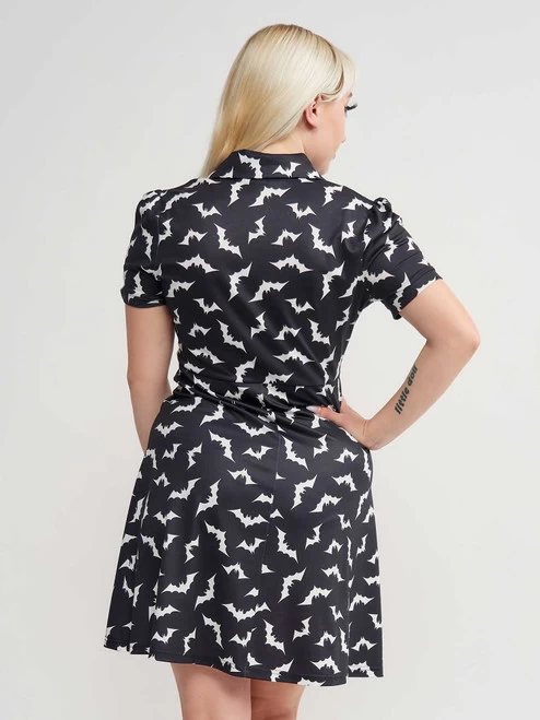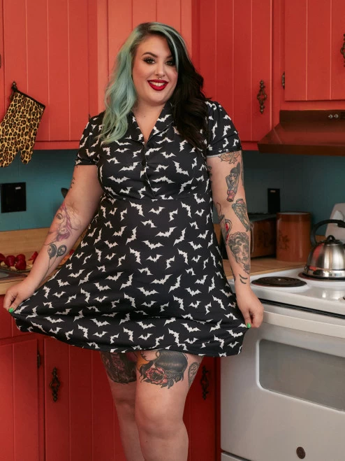 I know, we can’t believe this is the first time we’ve made the Rosie dress in our black and white Luna Bats print, either! This dress screams goth pinup style! The Rosie dress is made out of a stretchy poly knit, with a notched collar and three functional buttons on the bust.