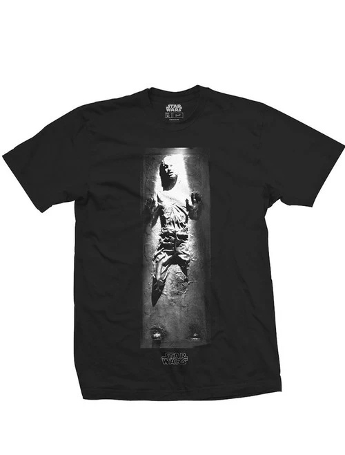 - An official licensed men’s cotton tee featuring the Star Wars ‘Han in Carbonite’ design motif.