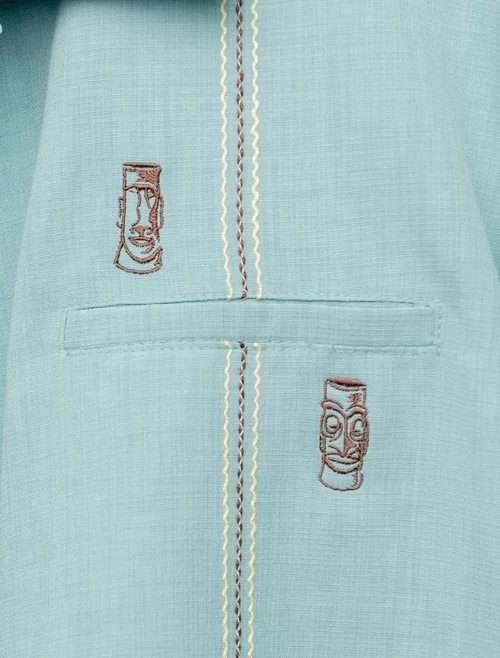 - This lightweight button up features a contrast running stitch and two tiki totems in brown and gold and a functional pocket. Custom metal Tiki buttons add an extra flair to this stylish shirt.