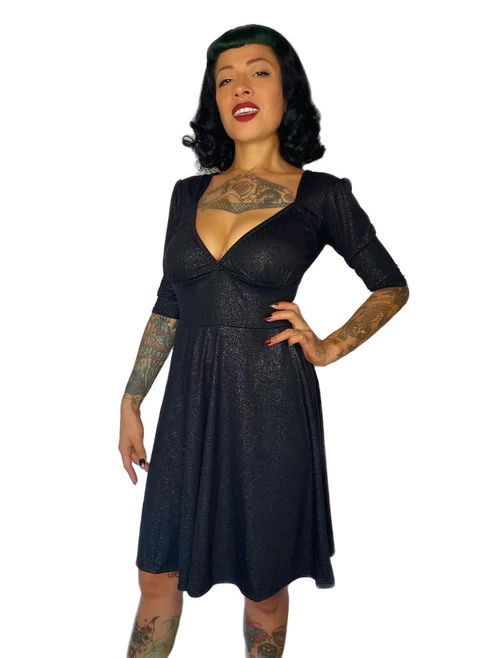Switchblade Stiletto Lola Dress – Soft black dress with silver glitter. Made From Stretch Cotton Jersey, 3/4 Sleeves with V-neck, Waist Band, and Flare skirt, Made In USA