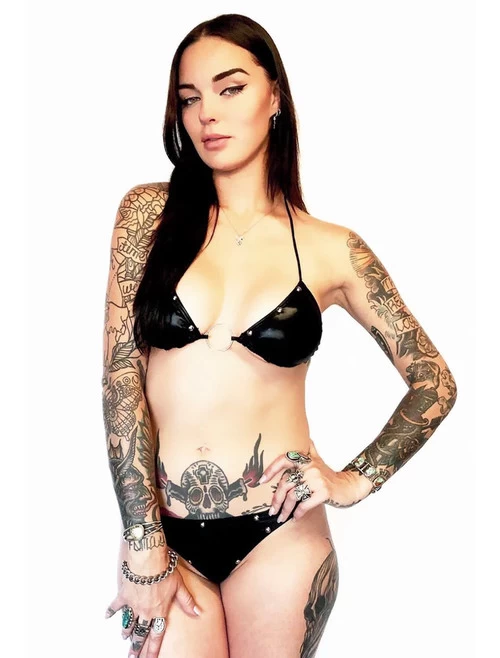 - This studded bikini swim suit ties up at the back and features studs around the edges as well as a metal O-ring in the centre of the top.