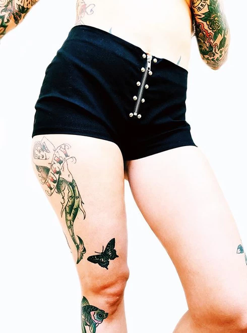 Switchblade Stiletto Studded Zipper Short – stretch cotton canvas, 5″ zippers, 10 stud. 97% cotton, 3% spandex. Made in the USA.