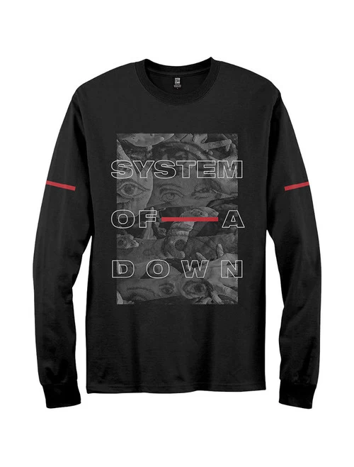 - Black unisex long-sleeve t-shirt featuring a front print of the System of a Down “Eyes” design.