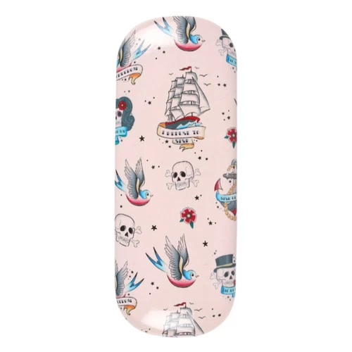 Retro skull, ship, sparrow and anchor tattoo illustrations cover this hard-shell glasses case that’s perfect for any tattoo or rockabilly fan.