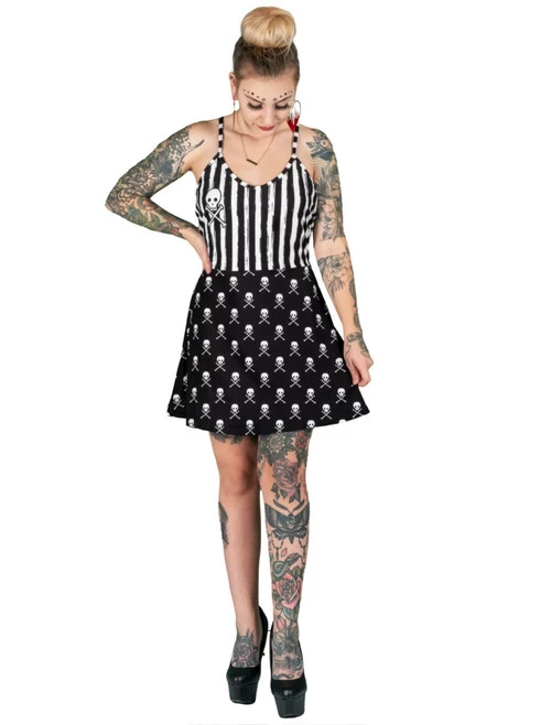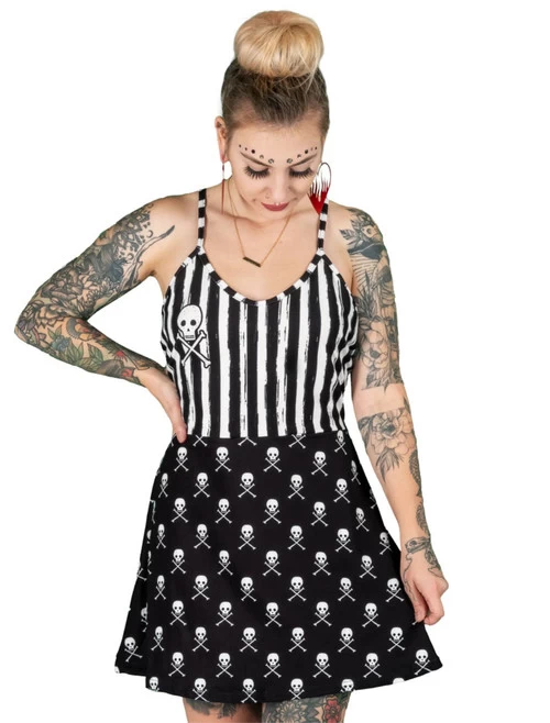 This dress just radiates cute lil pirate vibes! Distressed stripes and plenty of skulls & crossbones… No one would dare step to you in this Skully Striped Skater Dress. The Deep V Mini Skater Dress features a sexy deep v-neck, a low U-Shaped back, spaghetti straps, and a fit n flare style skirted bottom.