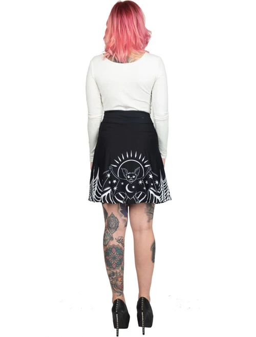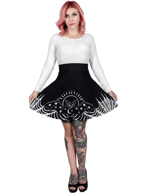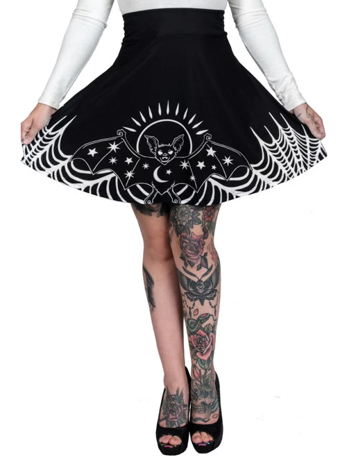 - Hypnotise those guys with your starry bat eyes in this retro skirt! The 50’s swing meets dark and deadly goth fashion. What a duo! This skirt has a soft touch and smooth fit with flare for days, just take a spin!