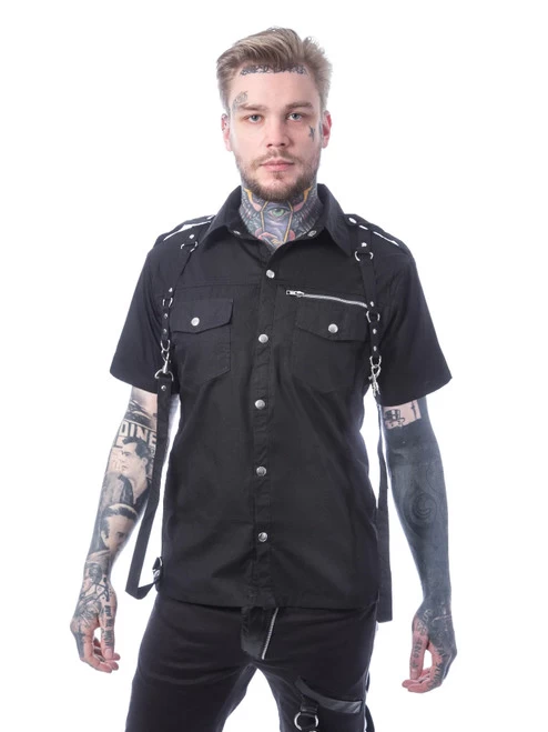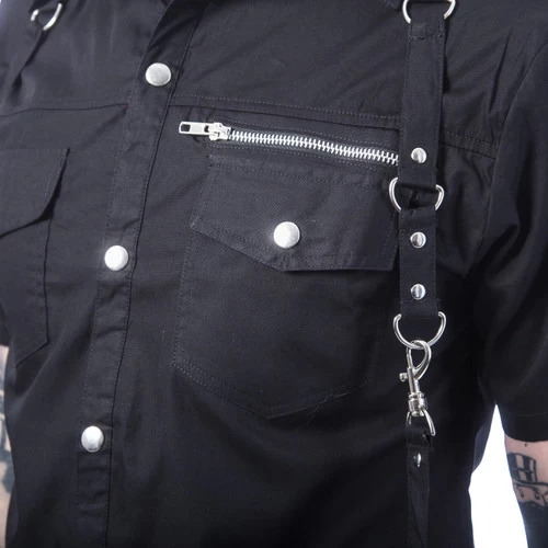 Black button up shirt featuring metallic snap buttons, front pockets, and bondage straps attached with d-rings.
