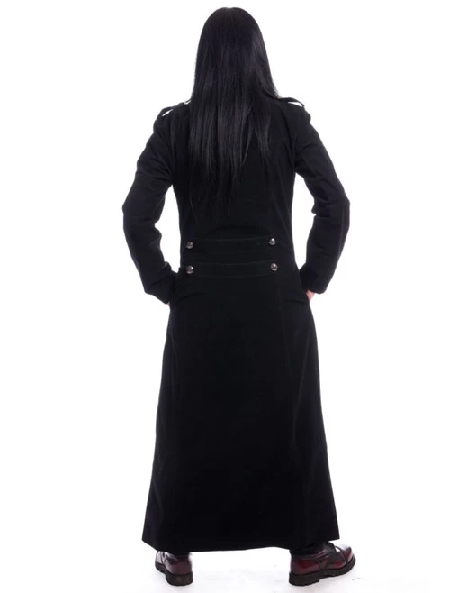 The Walker Coat from Vixxsin is a long, full-length coat made from velvet, featuring two rows of decorative, embossed metal buttons down the front and two on the back. The front buttons up to the waist, giving the appearance of a coat worn over a matching vest. The sleeves are lined with satin for comfort and the look is completed with epaulettes on the shoulder (with buttons matching the front).